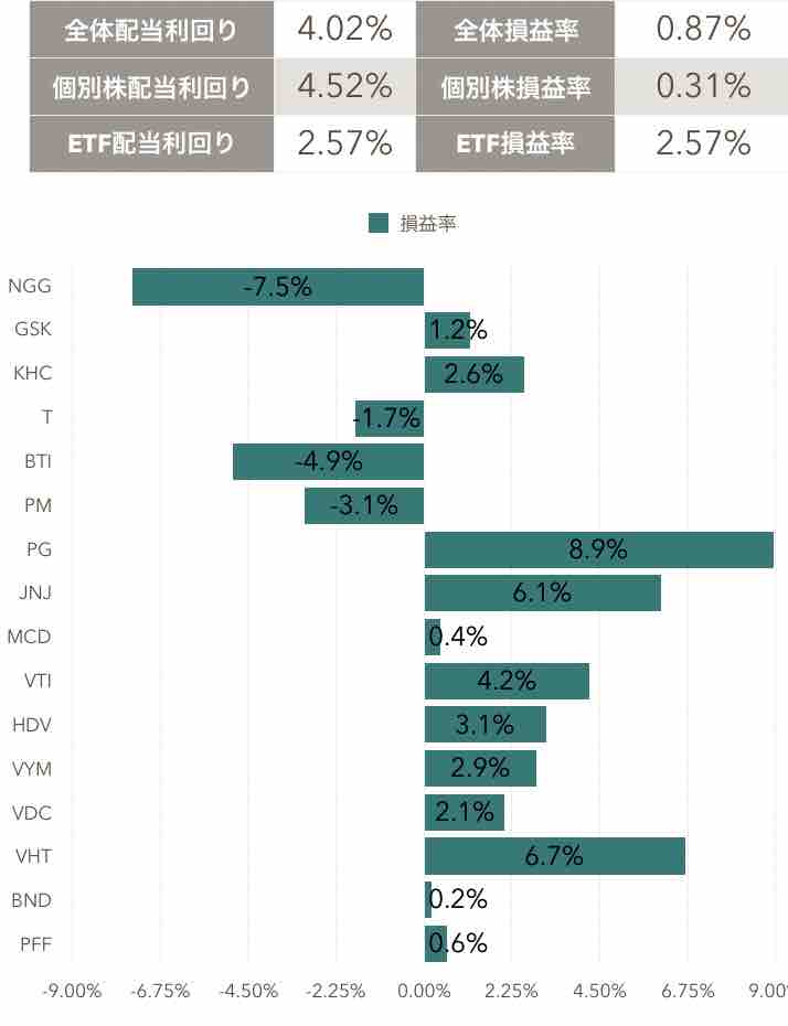 全体配当利回りと損益率、そして各銘柄の損益率